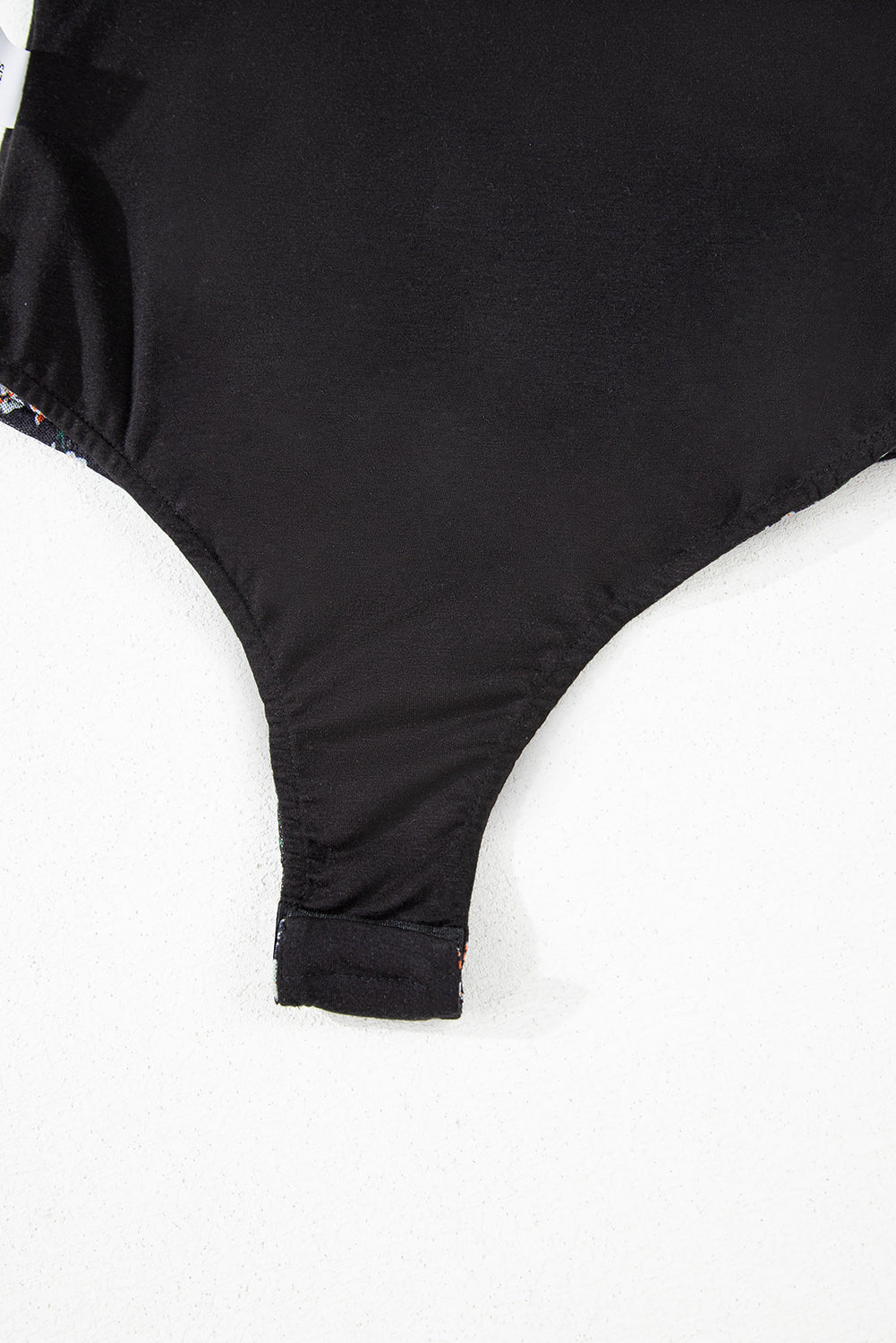 Black Floral Print U Neck Short Puff Sleeve Bodysuit