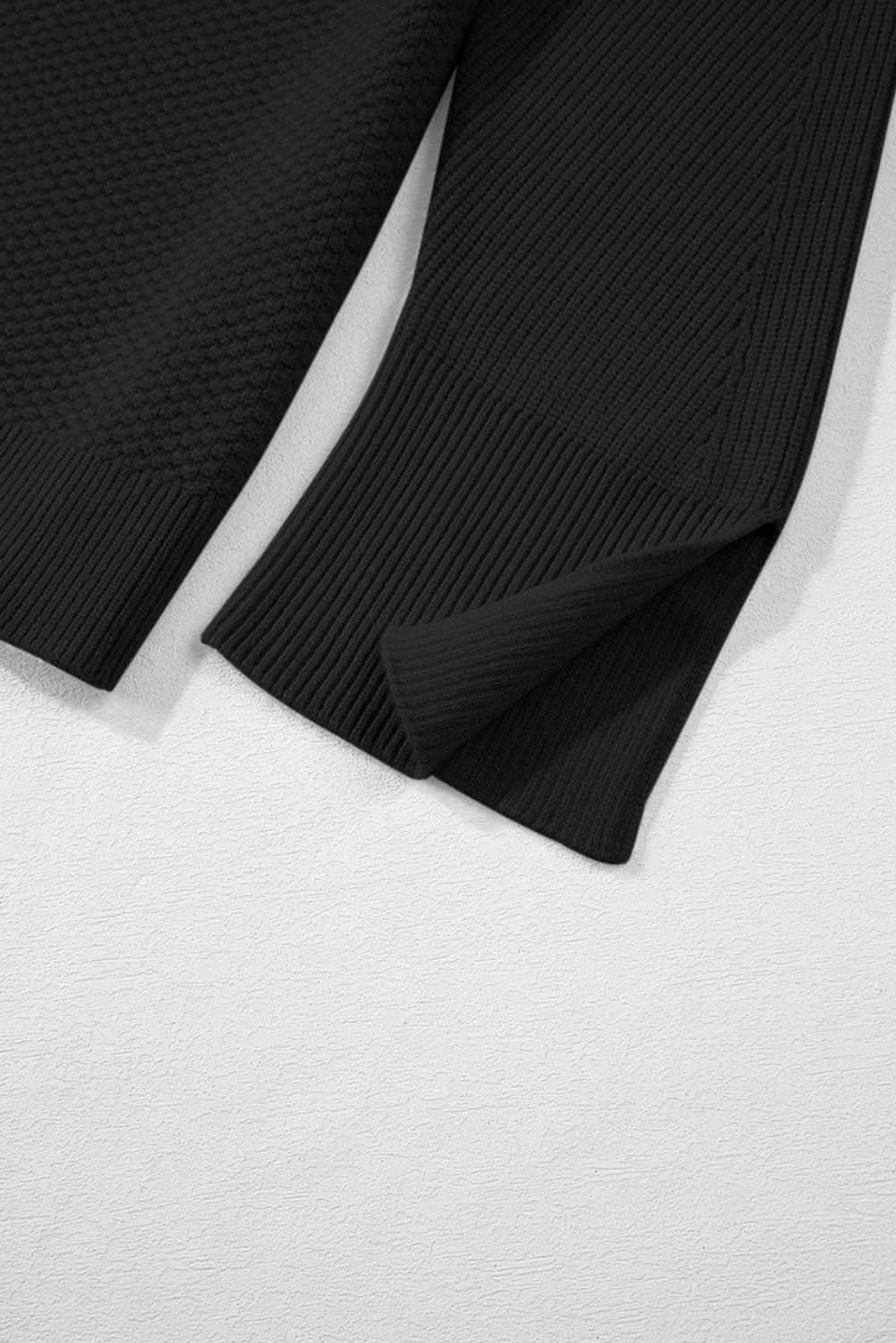 Black Solid Textured Knit Split Cuff Drop Shoulder Loose Sweater